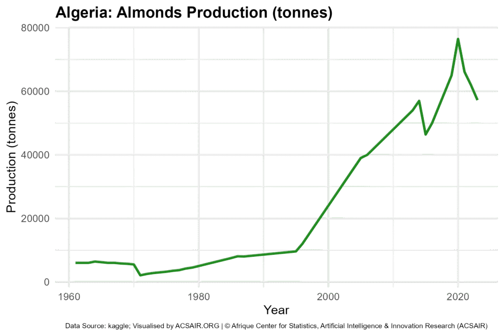 Figure 2. Algeria’s almond production in tonnes per year, 1961 to 2023, with a line trend similar in timing to the area chart but reflecting combined effects of area and yield.