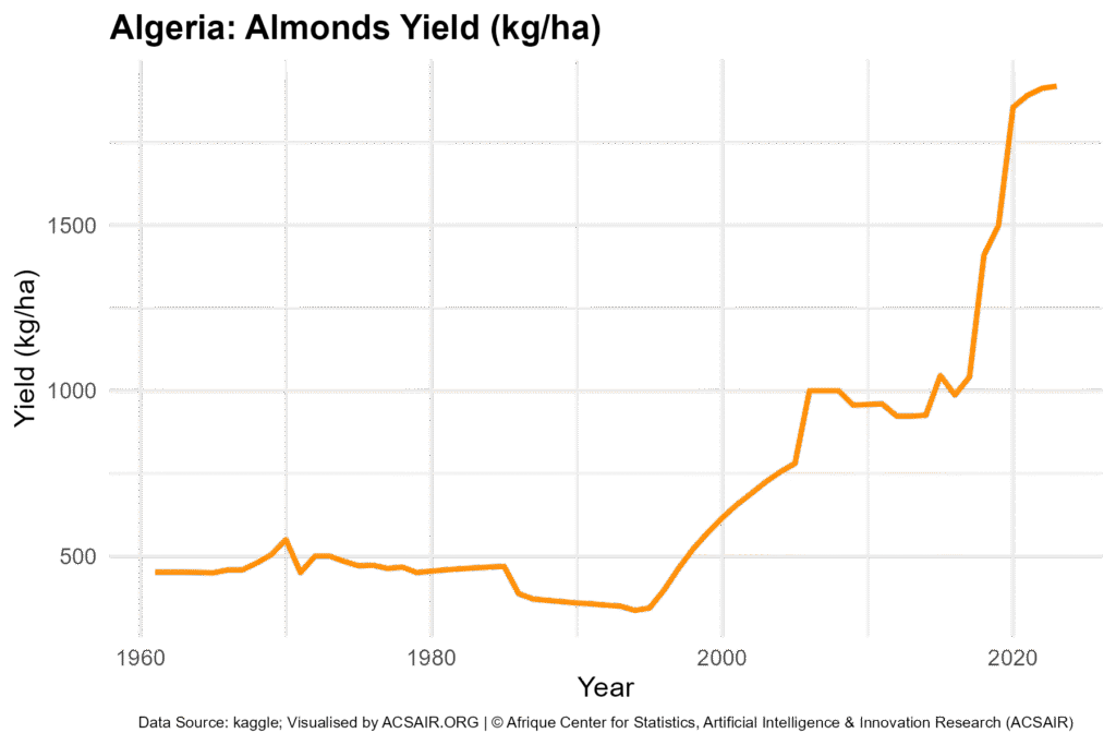 This report presents a comprehensive analysis of Algeria’s almond production data from 1961 through 2023. The dataset includes three key variables for almonds in shell: the area harvested in hectares, production quantity in tonnes and yield in kg per hectare. All charts referenced in this report were visualized by ACSAIR and are based on data sourced from Kaggle. The goal is to describe historical trends and changes in these variables without speculation, providing a factual account of how Algeria’s almond cultivation has evolved over the last six decades.