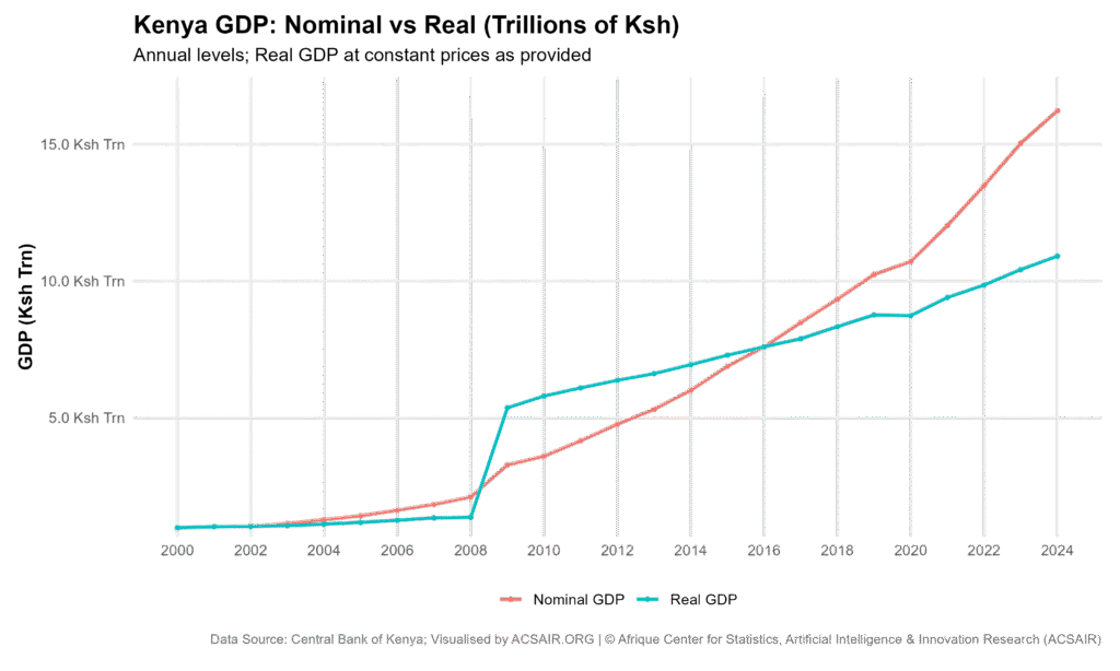 Figure 1: Annual nominal GDP versus real GDP for Kenya from 2000 to 2024.