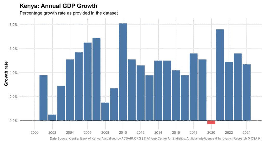 Kenya’s highest growth within 2000 to 2024 was 8.1 percent in 2010, a peak attributed to recovery momentum after the 2008 to 2009 slowdown. Through the 2010s, growth stabilized in a moderate range, for example, 5.1 percent in 2011, 4.6 percent in 2012, 3.8 percent in 2013, and around 5.0 percent in 2014 and 2015. The only contraction in this 25-year span occurred in 2020, when real GDP shrank by 0.3 percent, red bar, reflecting an extraordinary shock that year. This was an outlier in an otherwise consistently growing trend. The economy rebounded strongly in 2021 with 7.6 percent growth, then settled to 4.9 percent in 2022, 5.6 percent in 2023, and an estimated 4.7 percent in 2024. Overall, Kenya’s real GDP growth averaged roughly 4.5 percent per year over 2000 to 2024, indicating steady expansion. Most years, about two thirds of the time, saw growth in the 3 to 6 percent range, underscoring relative stability. The data highlight both resilience, with only one year of contraction, and variability, with growth swinging from near zero to above 7 percent.