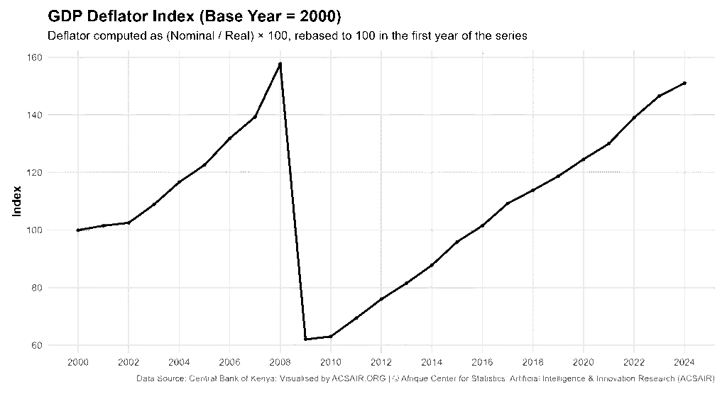 To analyze price level changes, a GDP deflator index was derived as nominal GDP divided by real GDP, multiplied by 100. This index reflects the aggregate price level relative to 2016. In 2016, the deflator is 100 by definition, since nominal and real GDP are equal in the base year. Kenya’s national accounts underwent base-year revisions during this period, notably in 2009 and 2016, introducing level shifts in the real GDP series. The data here align real GDP to the 2016 base; earlier years include rebased estimates, creating a discontinuity around 2009, when the base year was updated. All comparisons and growth calculations use the data as provided. Values are rounded to the nearest million Ksh, or converted to trillions of Ksh for readability, and percentages are rounded to one decimal place where appropriate.